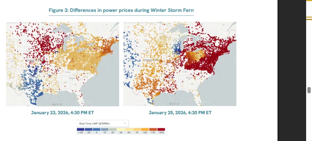 A new report by Grid Strategies' Michael Goggin for the Niskanen Center shows how power prices spiked during Winter Storm Fern (red = highest, blue = lowest). A bigger transmission grid would have allowed cheaper power to move to where it was most needed, a reality that gets repeated every big weather event.